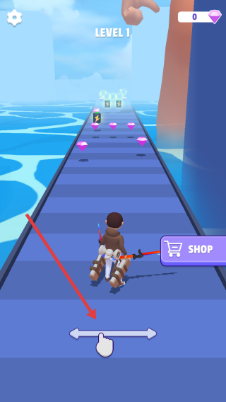 1、在Level1起始,滑动底部左右箭头,操控角色沿跑道移动,收集粉色钻石,避障碍,准备冲刺。