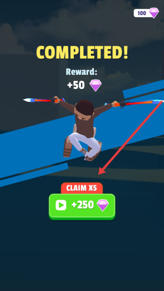 3、成功通关显示COMPLETED,点击绿色按钮领+250钻石奖励,积累资源,解锁新关卡、道具。