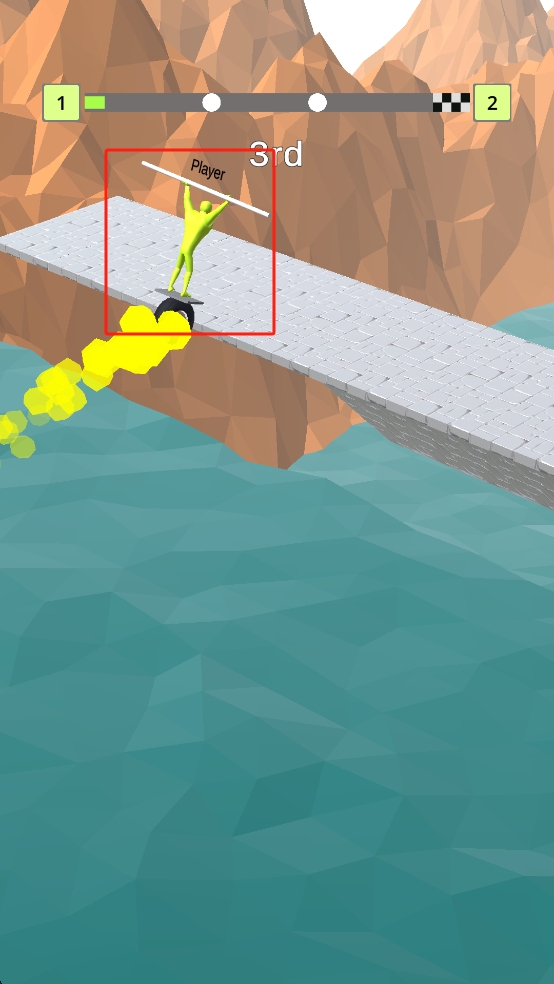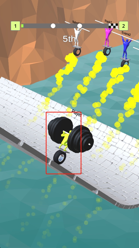 1、控制角色,借助杠铃保持平衡,在铺满砖块的赛道上前行,避开黄色烟雾干扰,超越其他选手。