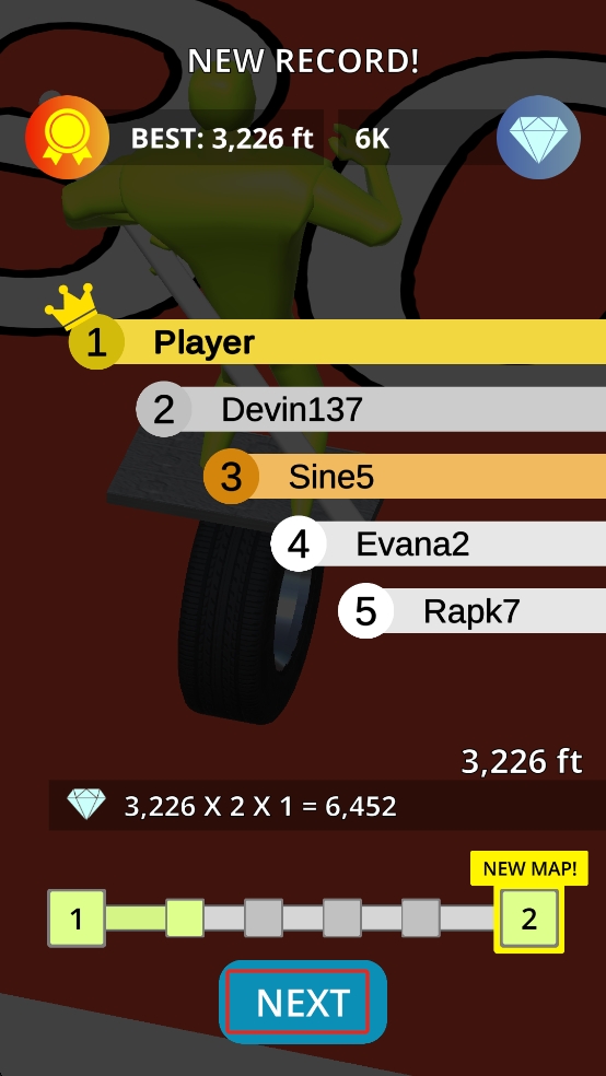 3、冲过终点后,查看排名与记录,点击NEXT按钮,可进入新地图开启下一轮的竞赛。