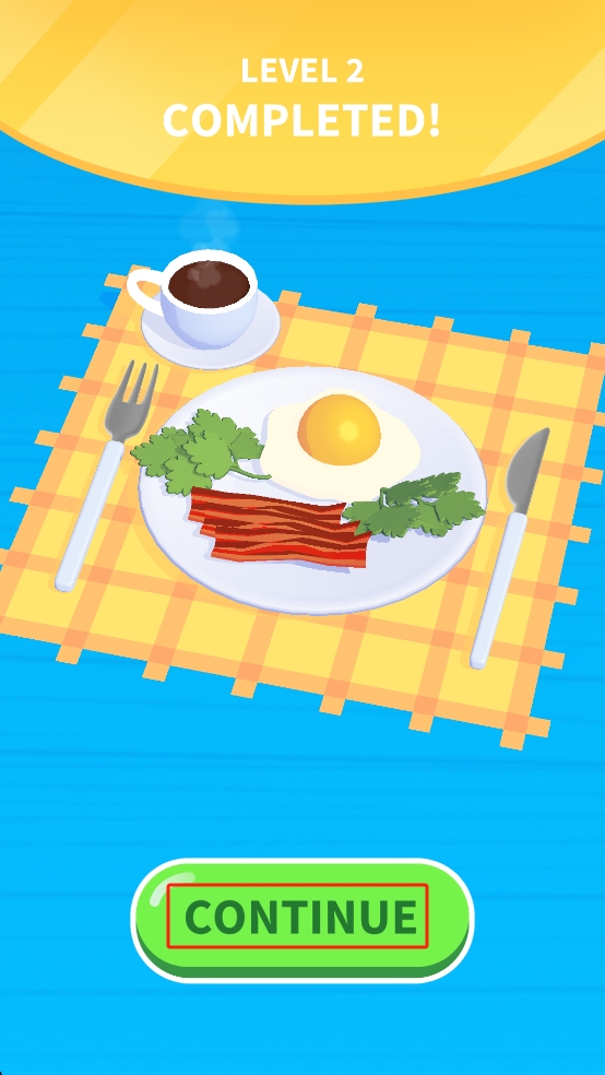 3、菜品制作完成呈现装盘效果,点击下方的CONTINUE”按钮,可进入下一关,挑战更多烹饪任务。