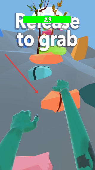 2、拉伸后,待Release to grab进度条,如2.9读完,松开手指,让手臂抓取彩色石块,向前移动。