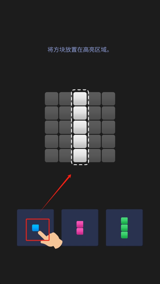 1、方块放置操作:从底部选择方块,拖动至上方棋盘的合适位置,将相同形状的方块拼接,当一行或一列被填满时即可完成消除。