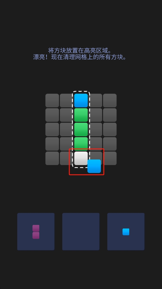 2、继续按要求,把方块放置到对应高亮区域,之后清理网格上已有的所有方块,推进游戏进程。
