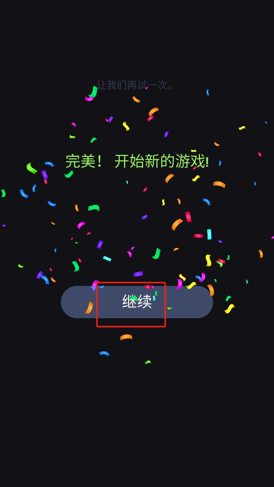 3、关卡完成后,点击继续按钮,可开始新的游戏,挑战更多方块放置与清理任务。