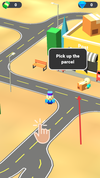 1、在街道场景,按Pick up the parcel指引,操控角色移动,拾取包裹,开启配送任务。