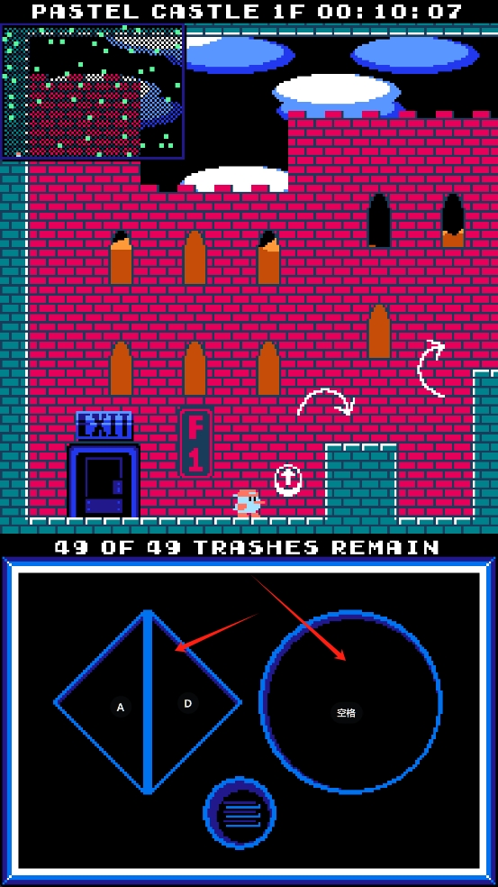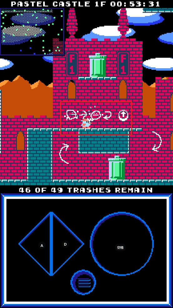 1、利用虚拟按键控制角色左右移动以及跳跃,在城堡1层收集垃圾,靠近垃圾时按空格拾取。