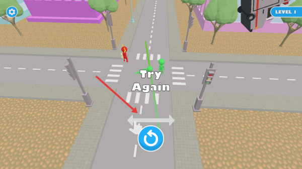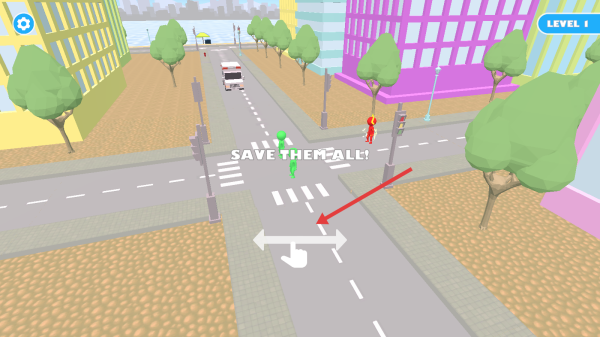 1、在Level1街道场景,按SAVE THEM ALL,滑动箭头操控角色,保护绿衣行人,避车辆。