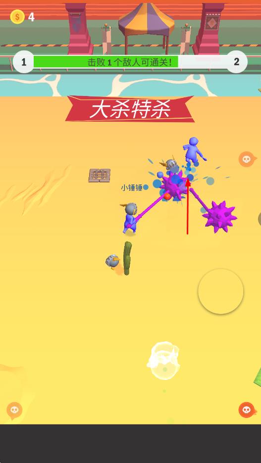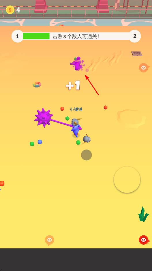 1、基础对战操作:通过虚拟摇杆控制角色移动方向,点击攻击键挥动大锤攻击对手,长按可蓄力释放更强力的锤击动作。