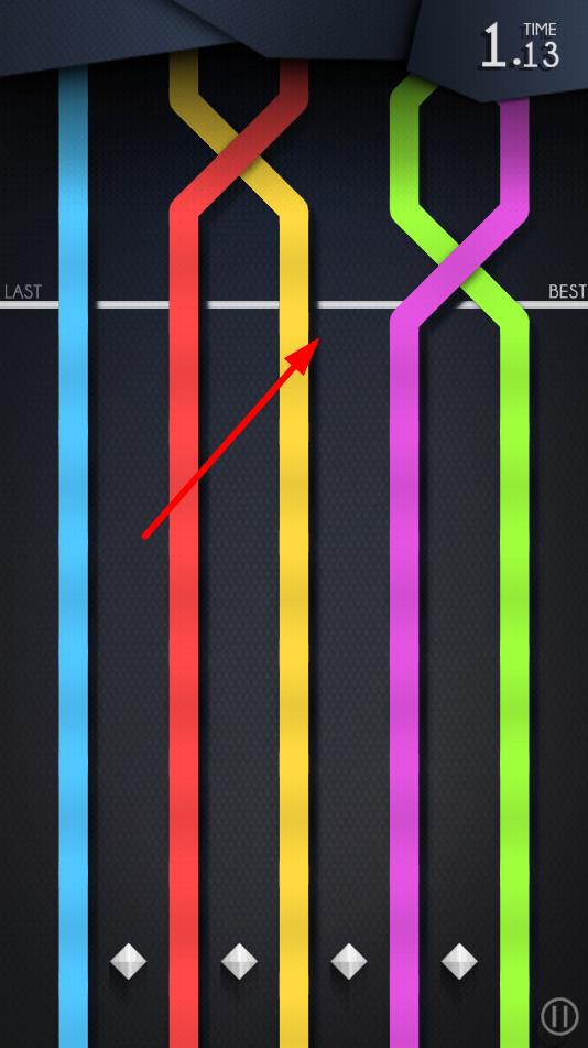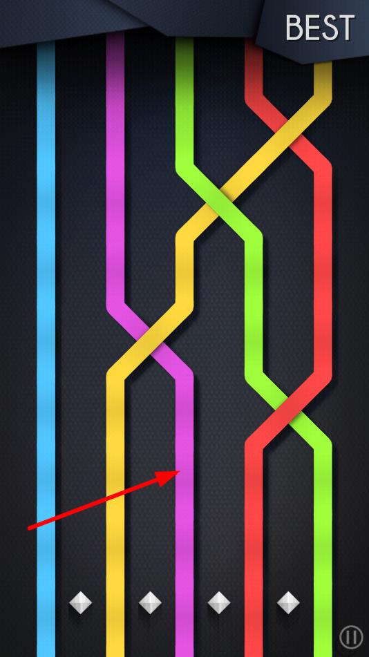 1、进入游戏后选择初始关卡,点击两根绳子间的空隙完成位置交换,注意避免绳结接触底部导致失败。