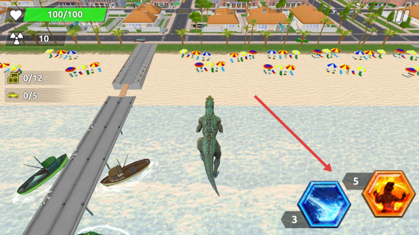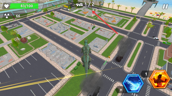 1、操控恐龙绿色在海滩场景,点击右侧技能,如蓝色、红色,破坏目标船、建筑,完成任务。