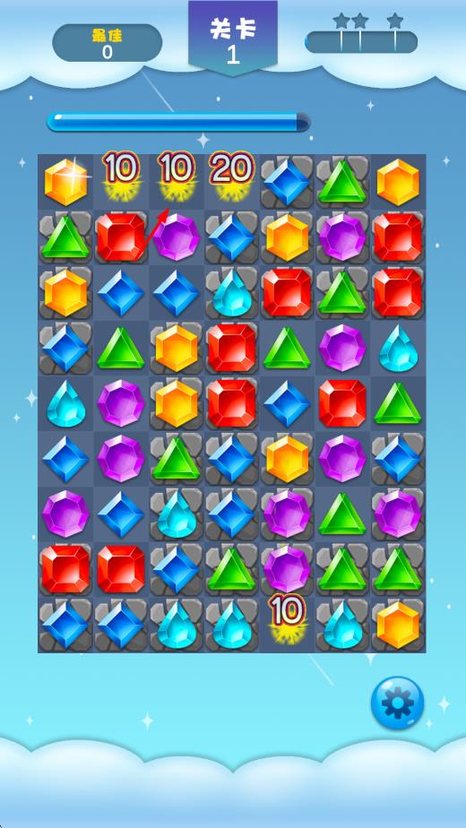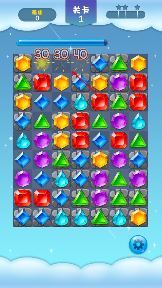 1、基础消除操作:滑动屏幕就可以交换相邻宝石位置,当三个及以上同色宝石横向或纵向相连时自动消除,获取对应分数。