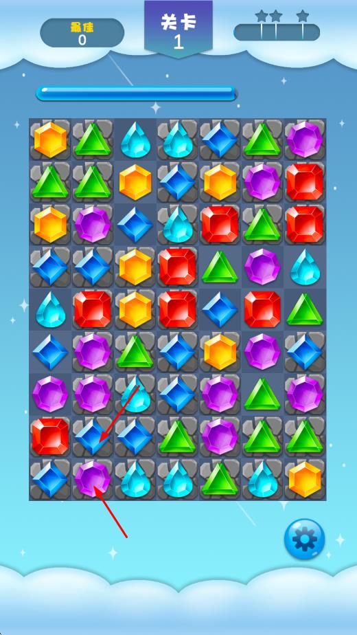 1、进入游戏选择关卡,观察初始宝石矩阵布局,通过滑动屏幕交换相邻宝石,尝试形成三个及以上同色相连的消除组合。