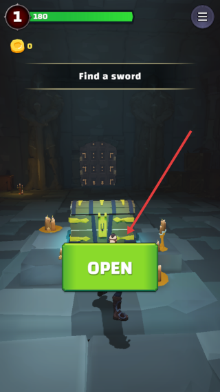 2、遇宝箱,按Find a sword指引,点击OPEN开箱,获取武器剑,提升战斗能力。