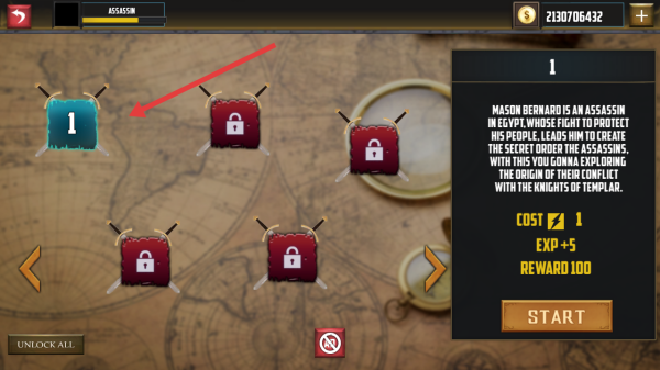1、在关卡选择,点击解锁的1关Mason Bernardo故事,付1体力,点START开启任务。