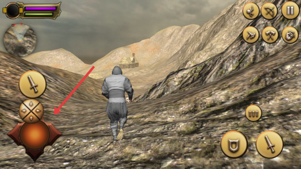 2、操控刺客角色,用左侧摇杆移动,沿山路找目标,如小木屋,遇敌人准备战斗。