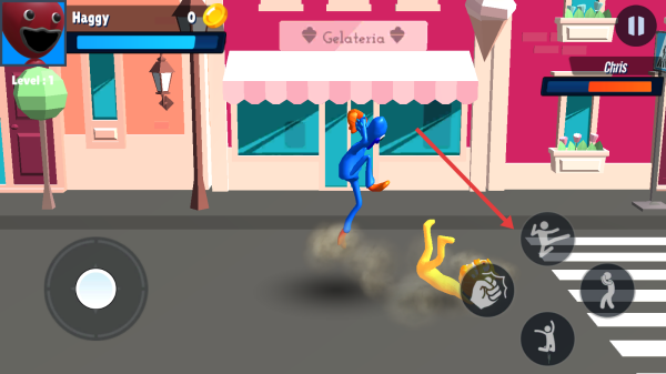 1、主界面点BATTLE,选解锁关卡(Level1,进入街头格斗,操控蓝色角色Haggy对战敌人Chris。