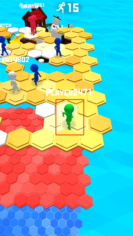 1、开局我们操控绿色小人在六边形网格上移动,避开其他颜色小人,寻找安全区域行进。