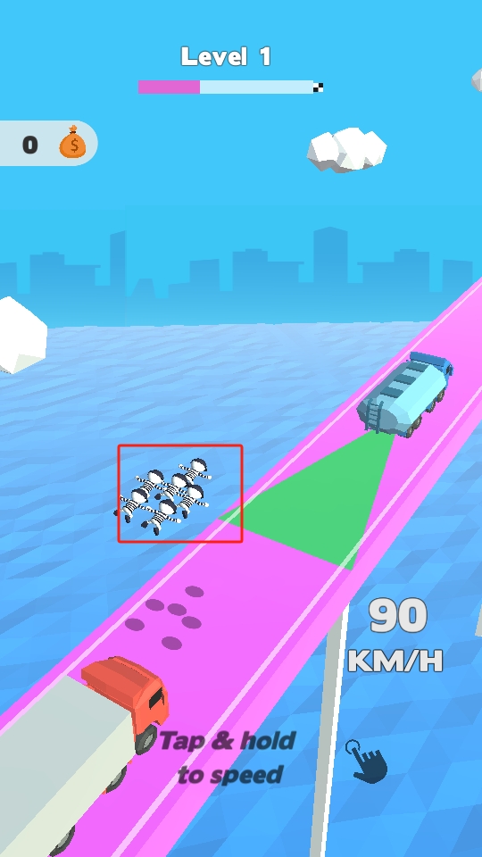 2、持续长按加速,让载有小人的车辆快速通过道路,在合适时机让小人转移到安全区域,躲避危险。