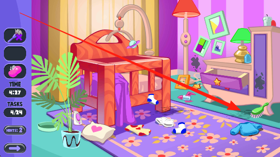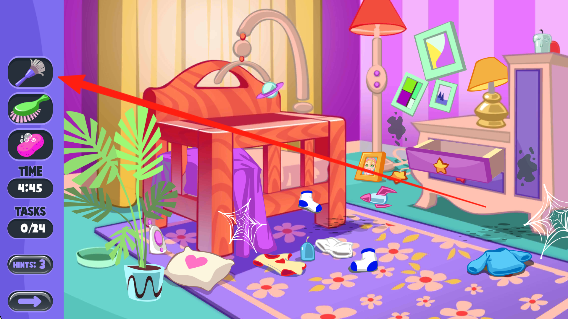 1、使用左侧的道具清理,了解各类清洁道具的使用方法,明确打扫与装饰的双重目标。