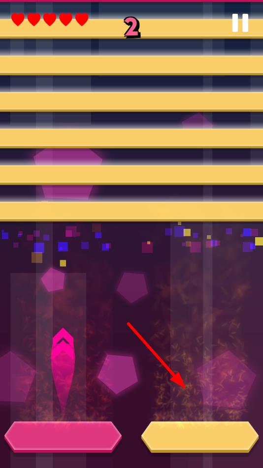 1、进入游戏后,观察屏幕上方下落的红、黄横条,当横条靠近时,点击对应颜色的发射按钮,发射导弹击碎同色目标。