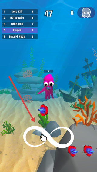 2、在海底场景,按指引∞符号滑动屏幕,控制章鱼移动,收集鱼类、躲障碍,提升积分、击败对手。