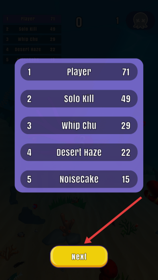 3、战斗结束,查看排名Player等,点击NEXT,积累操作技巧,解锁新章鱼、升级属性,挑战更高段位。