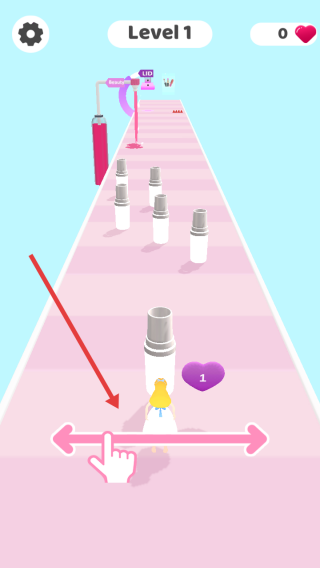 1、Level1开局,用左右滑动操作角色,收集口红管银色空管,避赛道障碍如粉色喷枪,往LIP标识方向前进。