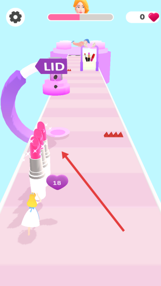 2、跑酷中,优先收集粉色口红成品,经LID环节盖盖子,躲尖刺障碍,积累口红数量,向终点冲刺。