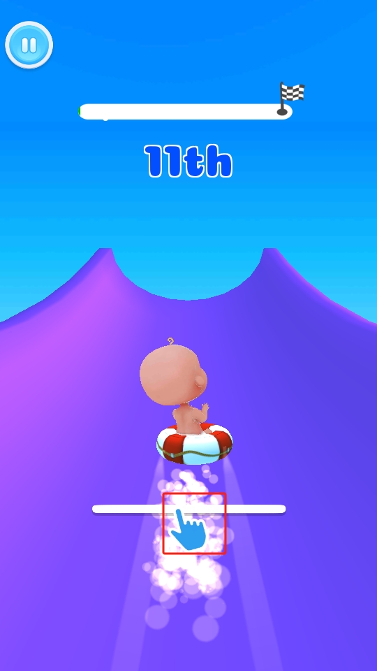 1、开局我们操控坐在红白相间游泳圈里的角色,按提示点击相关区域,让角色在紫色滑道上快速前进。