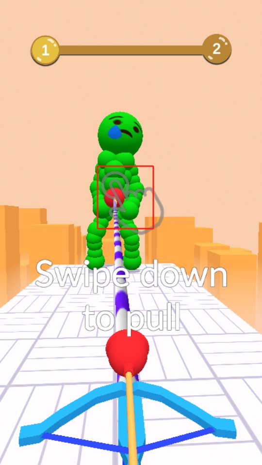 2、按照提示向下滑动,拉动弓箭,瞄准绿色人形目标发射,击中目标使其出现哭泣表情,推进游戏进程。
