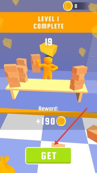 3、顺利搬运箱子抵达终点,Level1完成,点击GET领取190金币奖励,积累资源挑战更高Level。