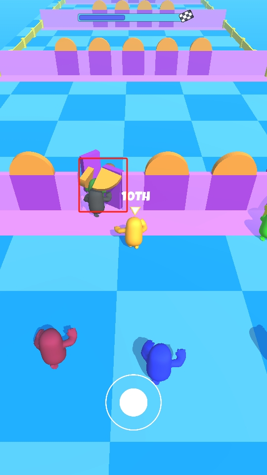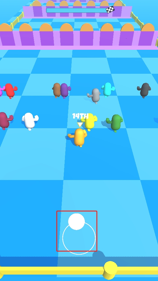 1、进入作品后,操控小人在蓝色方格赛道上移动,避开其他彩色小人,朝着终点方向前进。