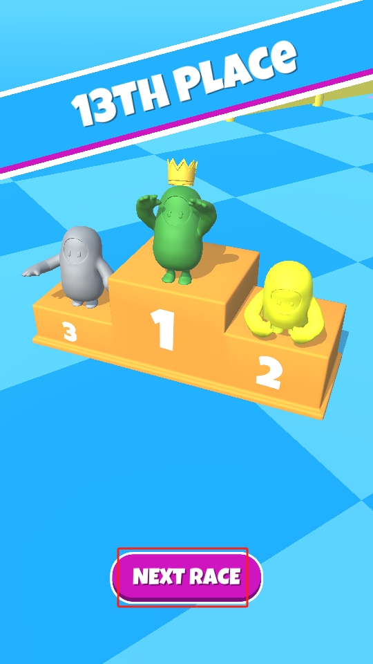 3、比赛结束后,界面显示获得第13名,点击紫色的NEXT RACE按钮,即可参与下一场比赛。