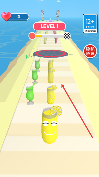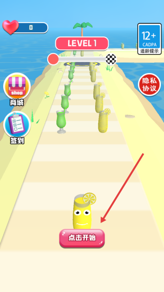 1、Level1点击点击开始,控制黄色柠檬饮料角色,沿沙滩跑道前进,避绿色饮料,向终点冲刺。