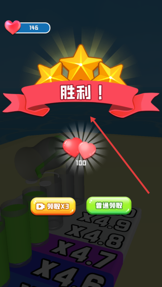 3、抵达终点,触发胜利结算,按需选领取×3看广告或普通领取,获奖励开新Level。
