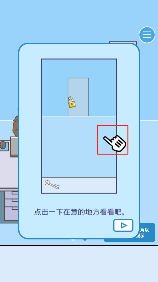 1、按照提示点击屏幕里自己在意的地方,仔细探索当前场景,尝试寻找可以打开那扇锁着的门的钥匙。