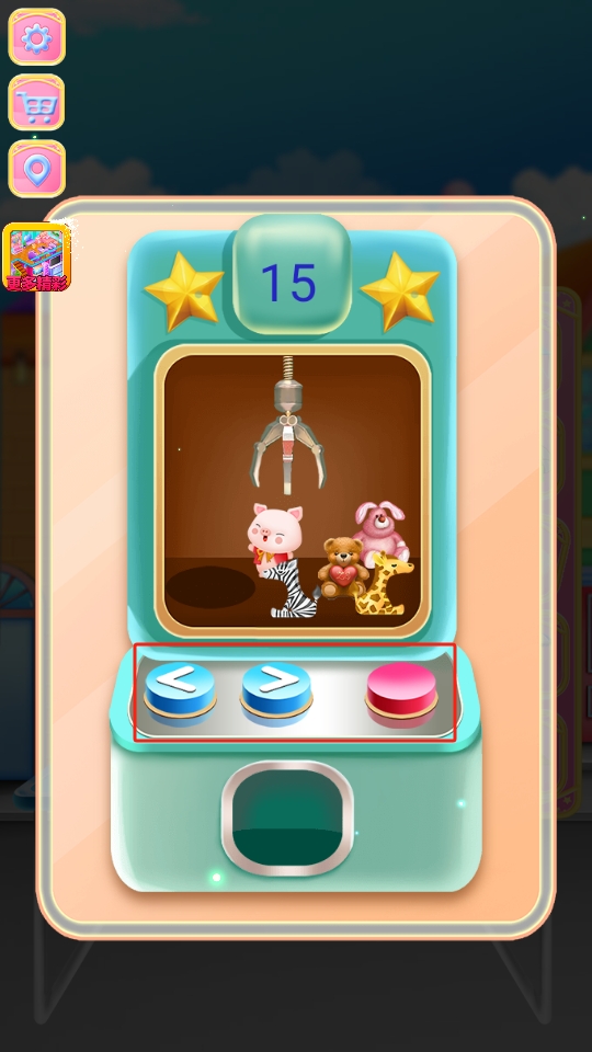 3、这里我们操作左右箭头按钮调整爪子位置,再点击红色按钮,尝试抓取里面的小猪、小熊等毛绒玩具。