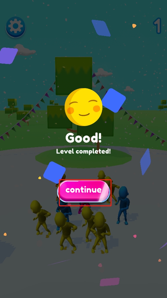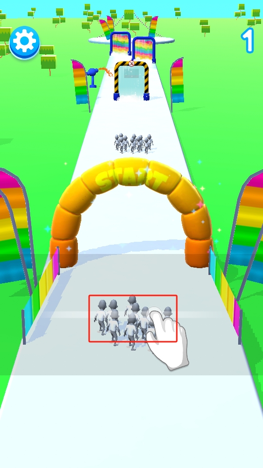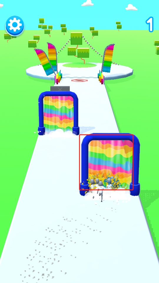 2、在赛道行进中需要引导小人队伍穿过彩色拱门,通过拱门时会有特效反馈,持续向终点推进。