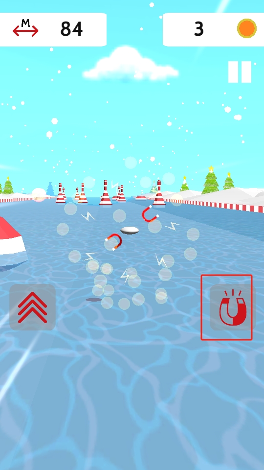 2、操控物体躲开障碍物,还能点击右侧磁铁图标,借助磁铁吸附道具来获取金币,推动游戏继续。