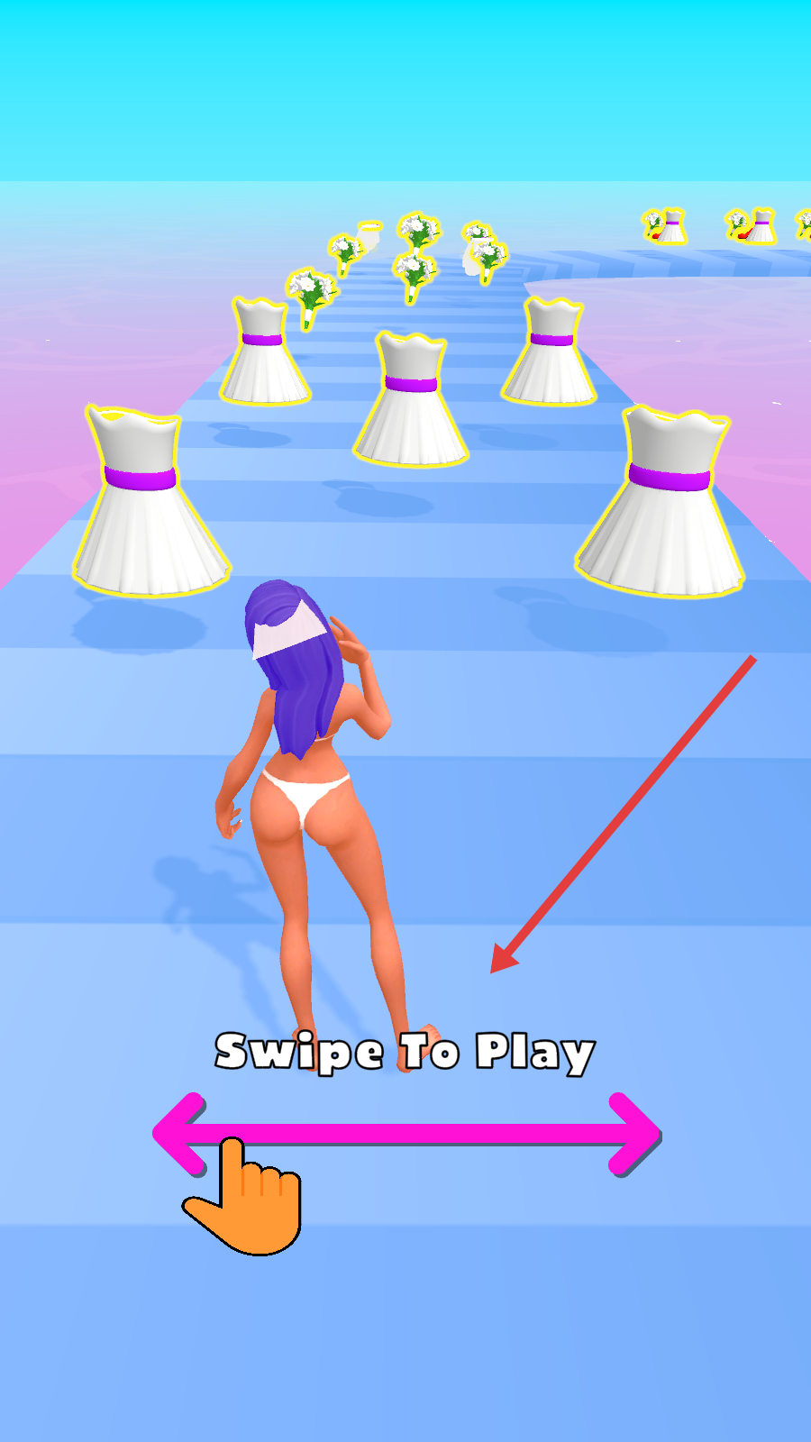 1、开局按SwipeToPlay,滑动屏幕控制紫发角色左右移动,避开白色礼服障碍,收集花束。