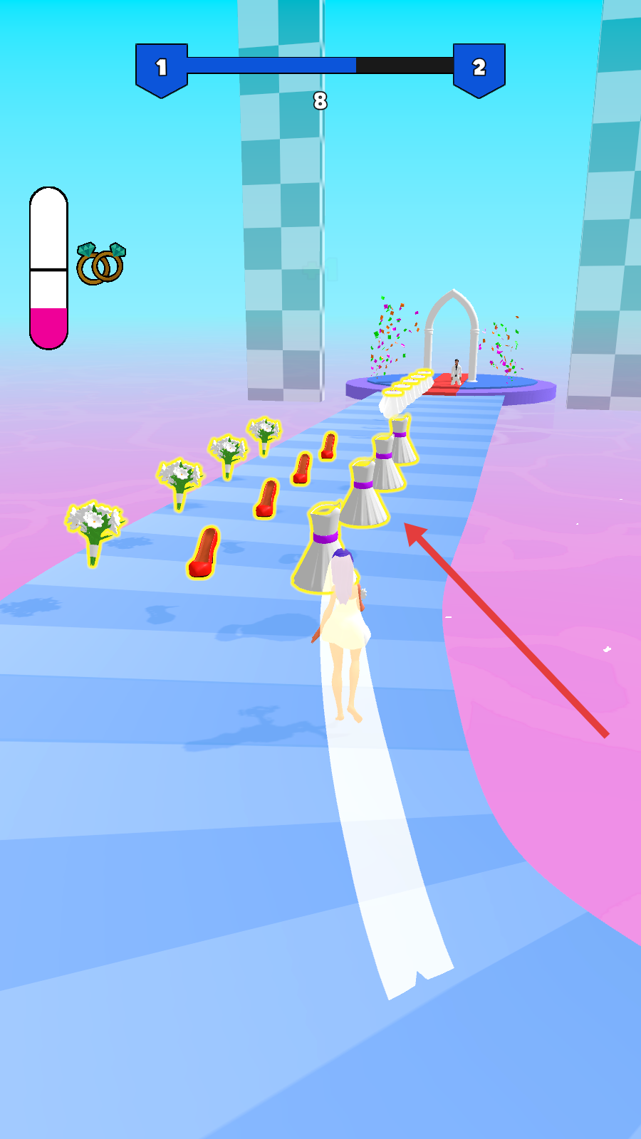 2、跑酷中,沿路径躲礼服、捡红鞋等道具,保持移动节奏,向婚礼拱门终点推进。