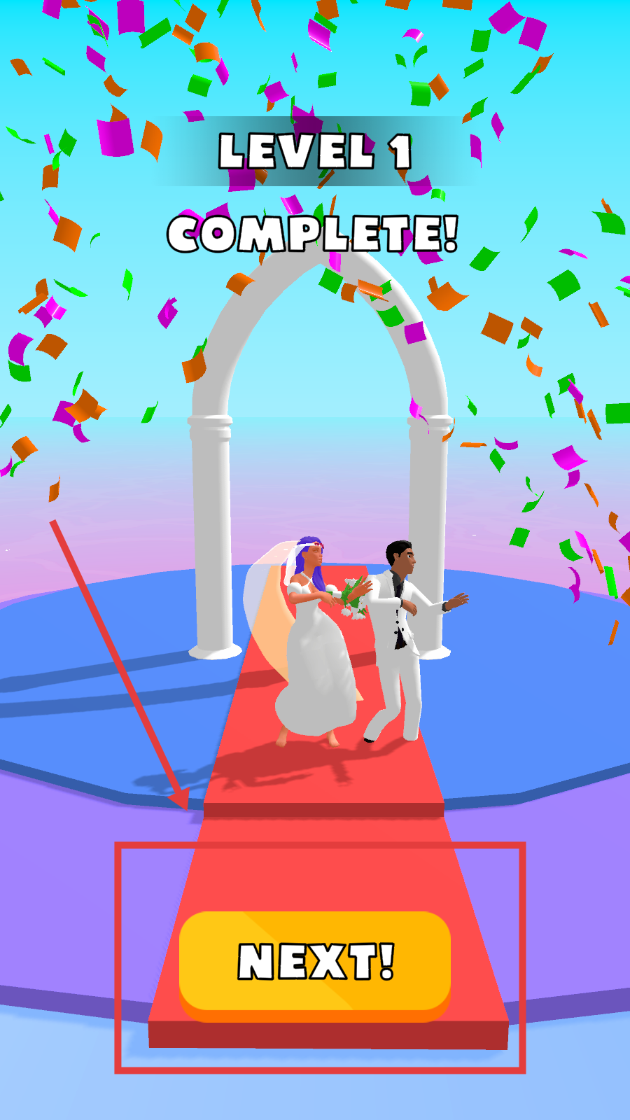 3、抵达拱门,Level1Complete,点击NEXT开启新关卡,积累操作技巧,解锁更多婚礼主题跑酷。