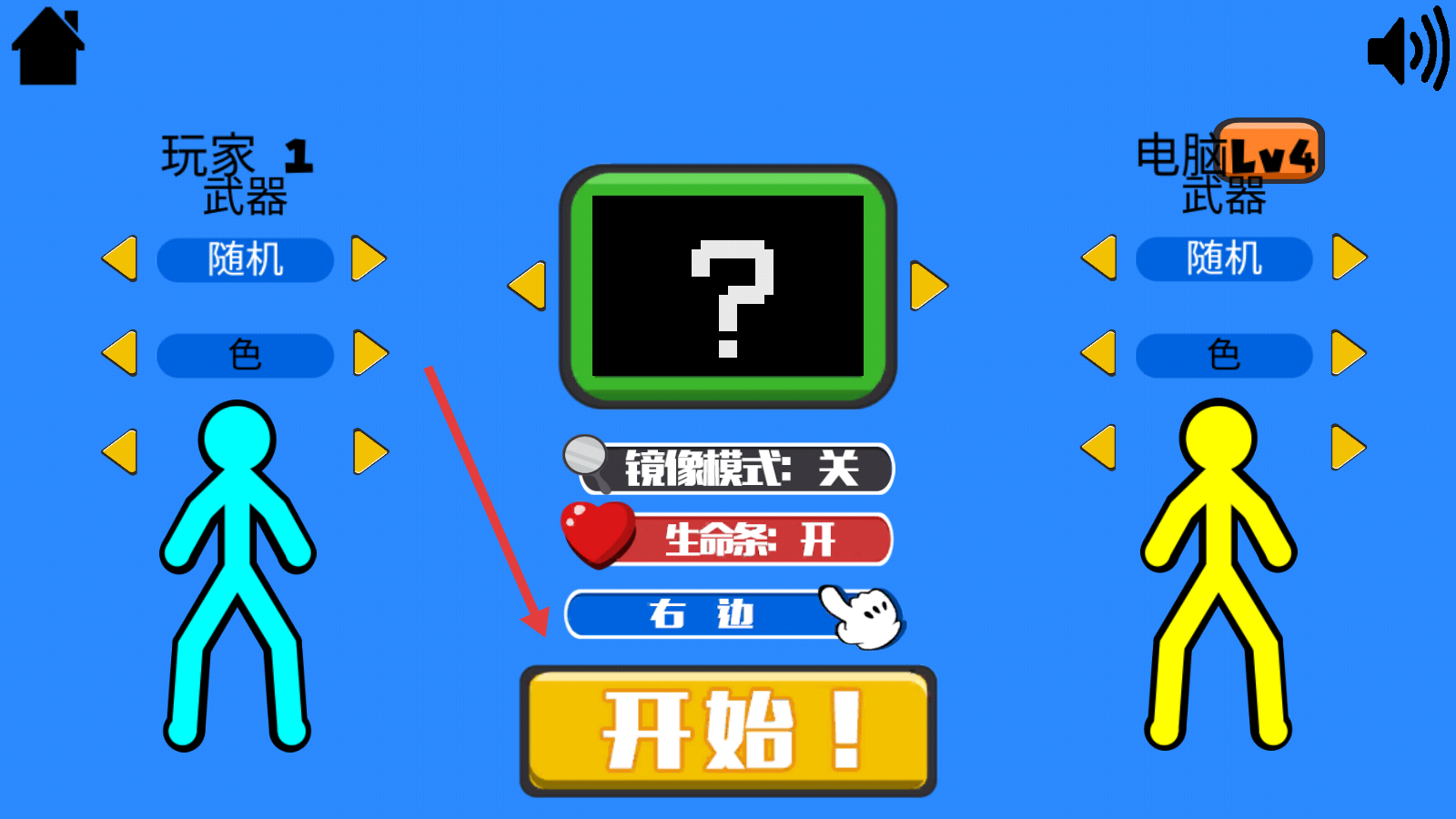 1、在武器选择界面,按需选玩家1武器随机,确认镜像模式关、生命条开,点开始进入对战。