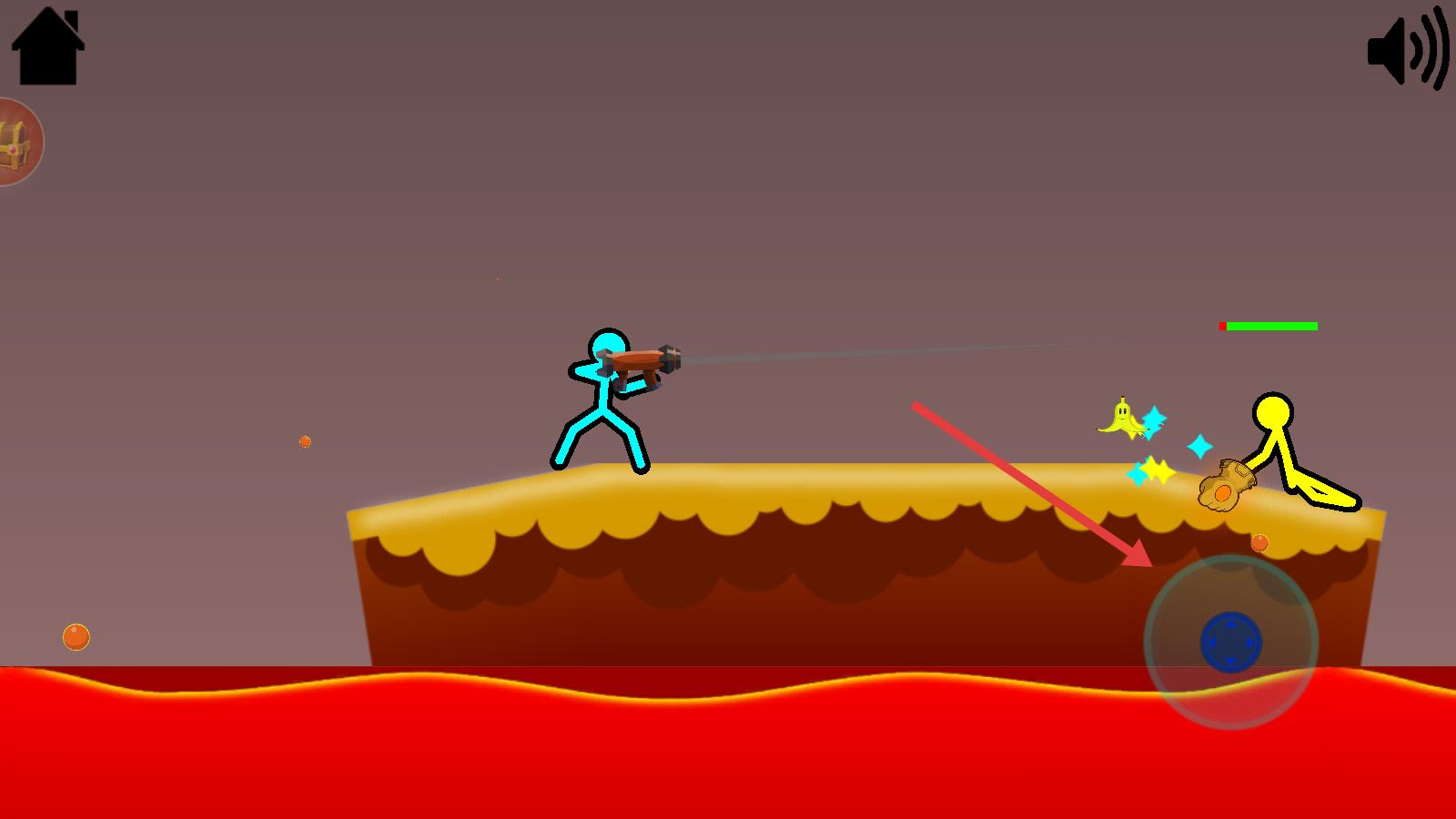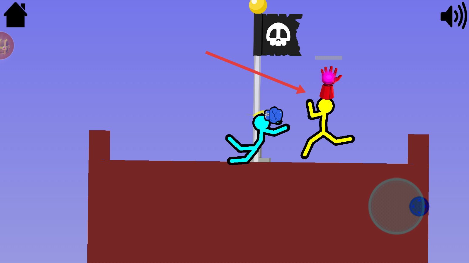 2、战斗时,操控蓝色火柴人,利用地形,如海盗船场景,靠近黄色敌人,用武器拳套/枪械攻击。