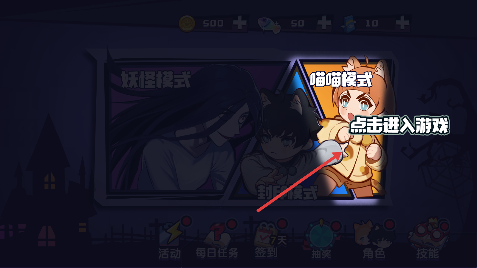 1、主界面选喵喵模式,点击进入游戏,确认金币500、道具数量,准备匹配对局。