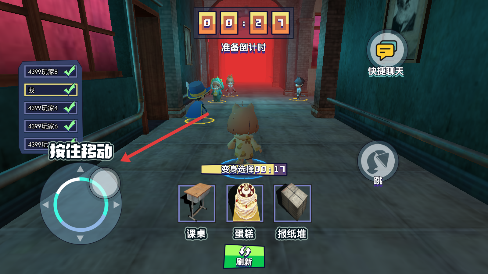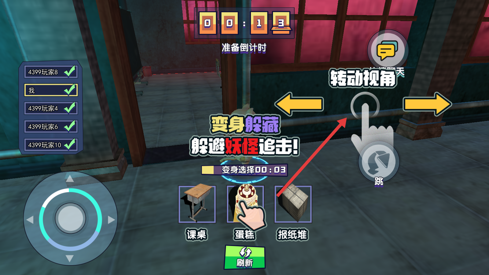 2、进入场景,用左侧摇杆按住移动,靠近队友,倒计时内选变身课桌/蛋糕/报纸堆,藏于场景。