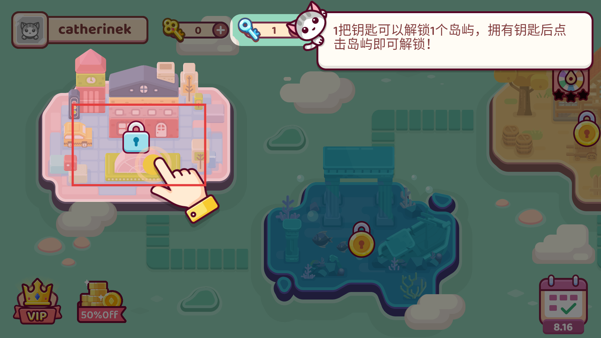 1、根据提示,使用钥匙解锁对应的岛屿,点击带有锁头标识的岛屿区域,开启该岛屿的相关内容。