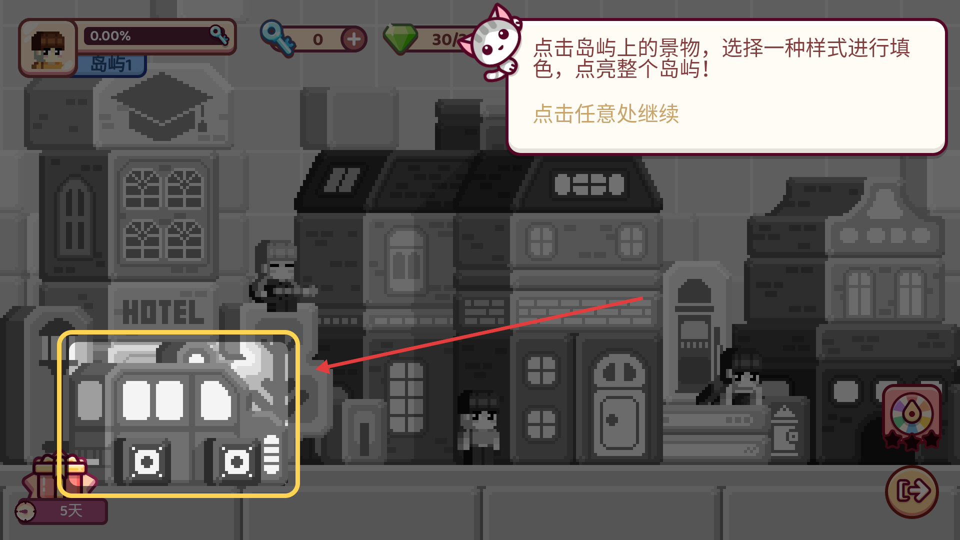 2、进入岛屿后,点击岛屿上的景物,从提供的样式中选择一种,对景物进行填色操作,逐步点亮整个岛屿。