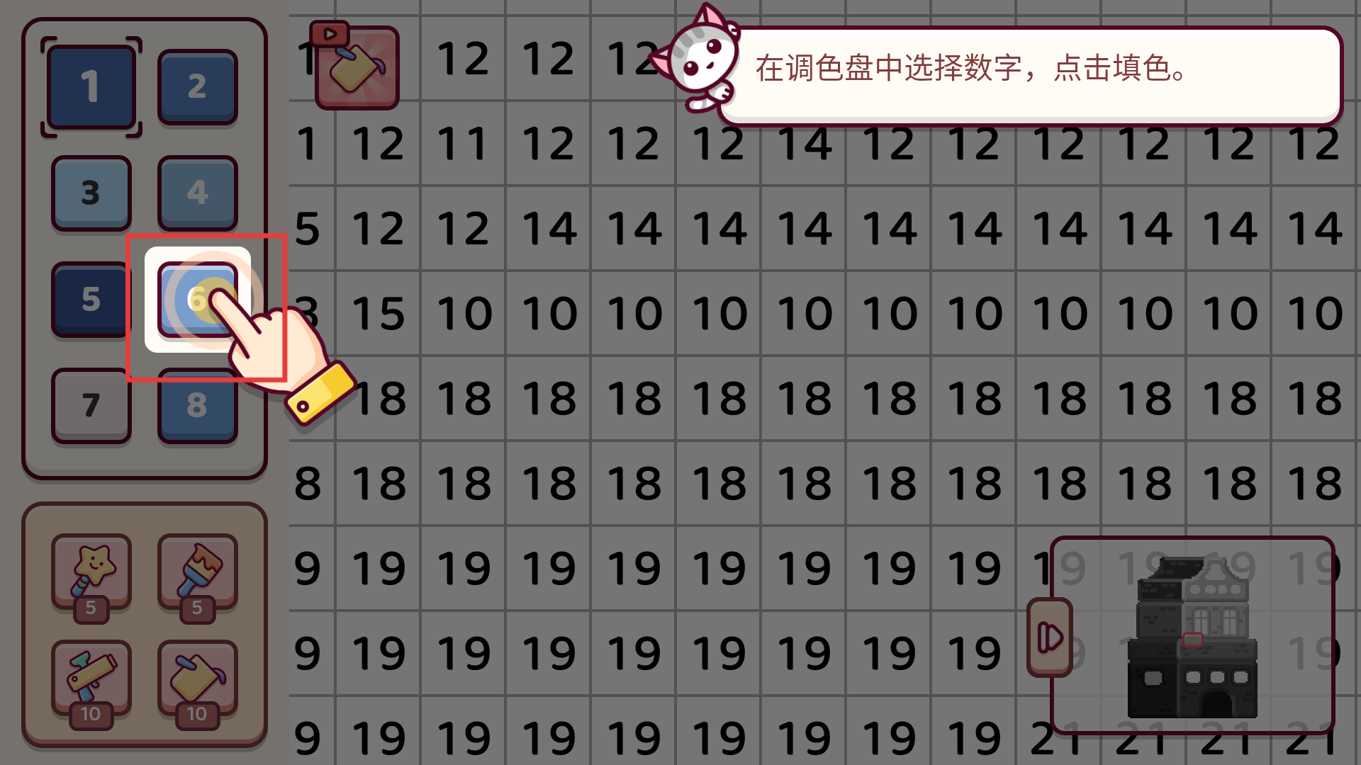 3、在填色过程中查看调色盘,选择对应的数字,然后点击需要填色的区域,完成填色,让图案逐渐丰富起来。